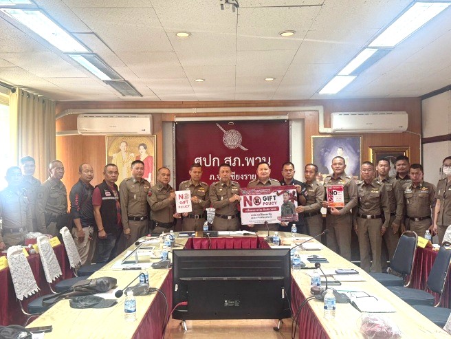 พ.ต.อ.จิตรกร ปาลกะวงศ์ ณ อยุธยา ผกก.สภ.พาน ประชุมชี้แจงเสริมสร้างคุณธรรมและความโปร่งใส โดยเน้นย้ำการต่อต้านการรับสินบน (Anti – Bribery Policy) และการไม่รับของขวัญ ของกำนัล หรือประโยชน์อื่นใด (No Gift Policy) |